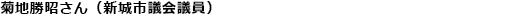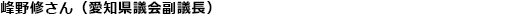 即戦力の期待の新人候補です。1000人近い新城消防団員の団長として10年余の長きにわたり、その任務を完遂されました。又政治に対する関心も高く、何度か政策を議論させていただきました。その市政に対する熱い思いと、実行力、統率力を持った、佐宗たつとし君が市議会議員として活躍されることを心から期待し、責任をもって推薦します。