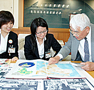 早川市長に派遣先を説明する内山さん、山田さん(右から)