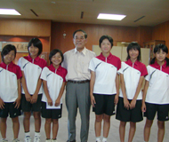 中野市長を囲んで。左から鈴木、小原、若山、山口、川村、松井の各選手(豊川市役所で)