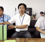 完成した設楽ダム環境アセス書3分冊を説明する山内所長(中央)