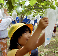 慎重にブドウに袋をかける児童