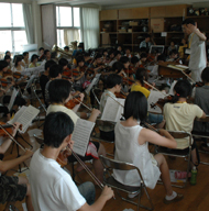本番に向けて練習する団員たち(5日、羽田中学校で)