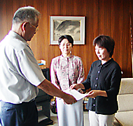 金原市長に要望書を手渡す吉見さんと石川さん(左から)