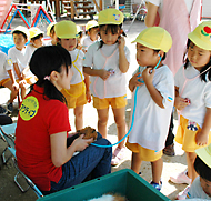 モルモットに聴診器をあてて心音を聞く園児たち(福岡保育園で)