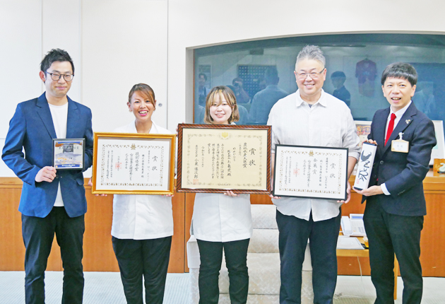 全国菓子大博覧会で豊橋市の和菓子店「お亀堂」が、出品したエディブルフラワーを使った寒天菓子「ゆめかなう」が農林水産大臣賞、富士山をテーマにした寒天菓子「Mt.Fuji.」が技術優秀賞に輝いた。市内の同じ和菓子店「絹一」も、特産のうずら卵を使った「豊橋カステラUZURA」が金菓賞を受賞した。それぞれ関係者が5日、長坂尚登豊橋市長を訪れ、受賞を報告した。