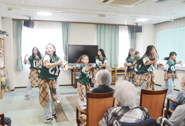 「敬老の日」の15日、豊川市のヒップホップダンス専門教室「AKDダンスアカデミー」の子どもたちが、同市国府町の介護付き有料老人ホーム「シニアヴィラ パトリ」を訪れ、お年寄りらにダンスを披露した。