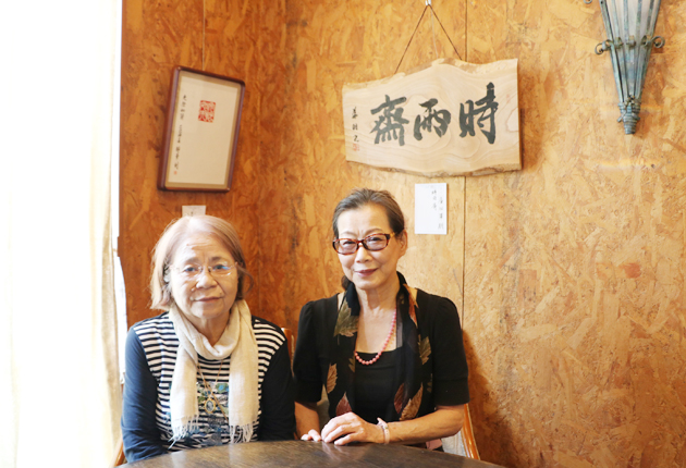 「書」について語る下坂さん㊧と廣田会長(わたなべ珈琲店で)