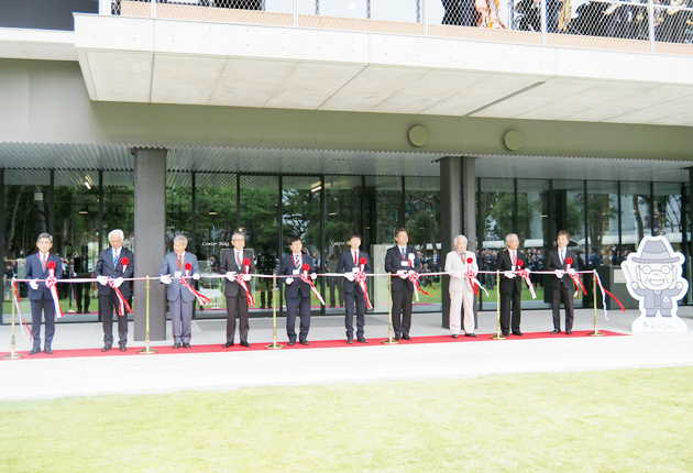 この後、建設報告や記念講演があり、在校生は愛大が取り組んでいる地域連携事業を紹介した。広瀬学長らがテープカットし、完成を祝った。