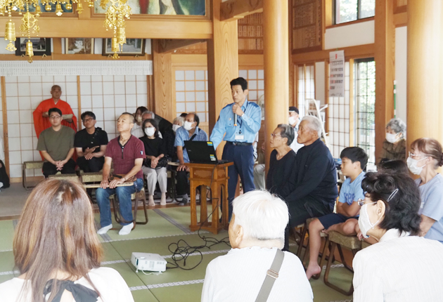 豊橋市東細谷町の医王寺で23日、防犯教室が開催された。同市で被害が増えている特殊詐欺について、豊橋署の署員が信徒らに講話した。 同署の橘英樹副暑長が講師を務めた。橘副署長は「特殊詐欺の中でも、最近はニセ警察詐欺や投資詐欺が多い」と話し「ニ...