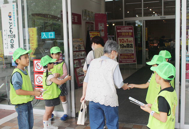 豊橋市福岡校区の交通少年団メンバーが23日、同市橋良町のスーパー「マックスバリュ豊橋橋良店」で交通安全キャンペーンを行った。福岡小学校の2年生から6年生まで14人が参加。学校近くの店舗で高齢者に反射材を手渡して安全行動を呼びかけた。