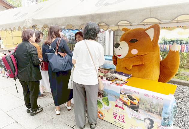 いなりんも一緒に豊川市への来訪をPRした(豊川稲荷東京別院で、提供)