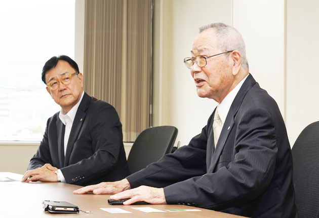 贈呈式に出席した彦坂守氏㊨と彰一氏(新城市役所で)