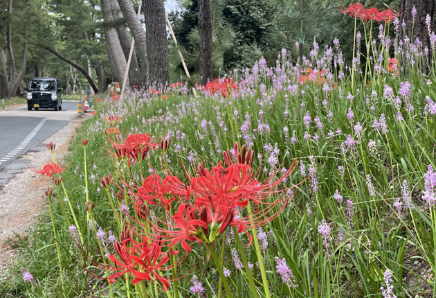 豊川市御油町にある国の天然記念物「御油の松並木」で、今年も彼岸花が見ごろを迎えた。立ち並ぶクロマツの木と、自生するツルボの花の開花も重なり、赤、緑、ピンクの3色のコントラストが旧東海道を歩く来訪者らを楽しませている。 今年も残暑の影響で2...