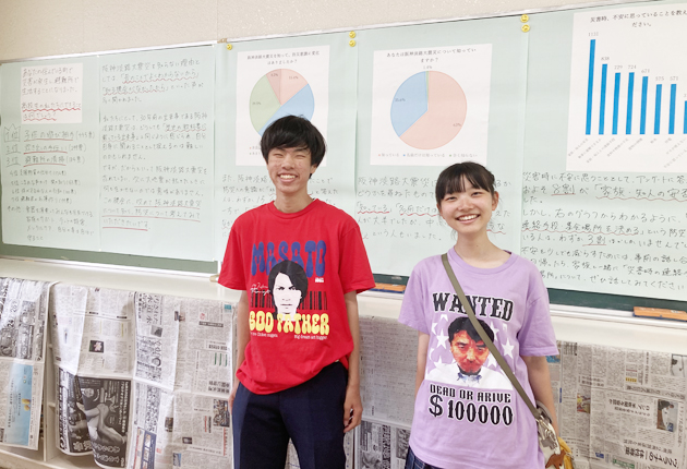 防災の展示を企画した松下さん㊨と山浦さん(桜丘高校で)