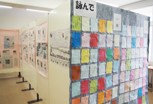 平和の企画では、3年生全員が「平和の俳句」を詠んで掲示。訪れた人が投票したほか、戦後80年に関する新聞記事も並んだ。どちらの展示にも生徒が集まり、興味深げに見ていた。