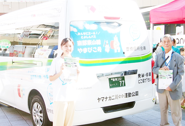 豊橋信用金庫(豊橋市小畷町)がネーミングライツ契約により愛称を決定した同市コミュニティバス「みんなにエール とよしんバス 東部東山線やまびこ号」が28日、公共交通利用促進イベント「とよはし公共交通フェスタ」開催中の豊橋駅南口駅前広場で展示...