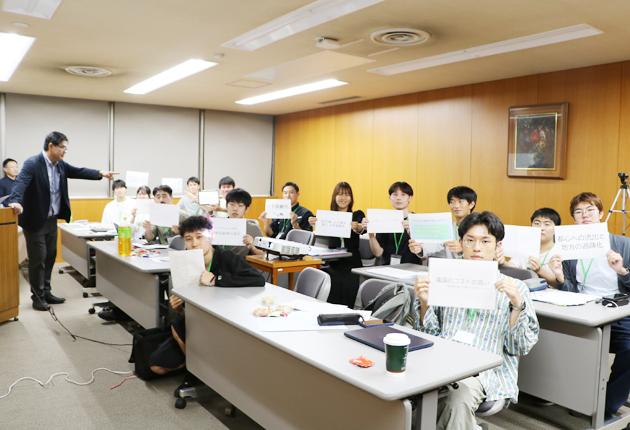 その後、学生たちは、事前に出されていた課題「現在の日本が抱えている問題点」を一人一点ずつ提示。その中から、外国人労働者の受け入れ、人口減少と過疎化、食料自給率の問題、少子高齢化について4グループに分かれてディスカッションした。