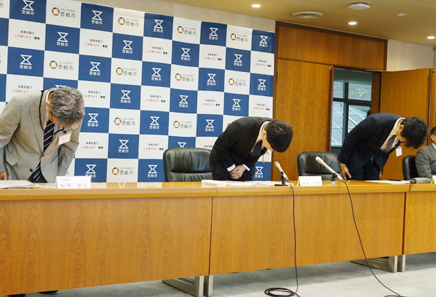冒頭、稲田浩三、島村喜一両副市長と起立した長坂市長は「市民に深くおわび申し上げる」と頭を下げた。「二度とこのようなことがないよう、徹底して再発防止に取り組む」と述べた。