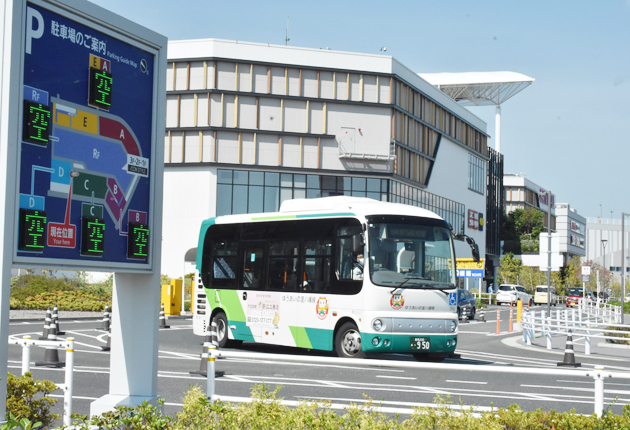 自動運転バスの停留所となるイオンモール豊川を出発するバス(豊川市白鳥町で)