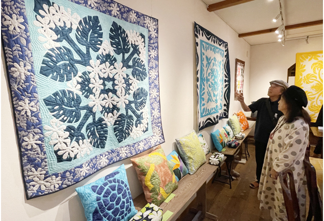 南国チックなパッチワーク作品が並ぶ会場(栄知村で)