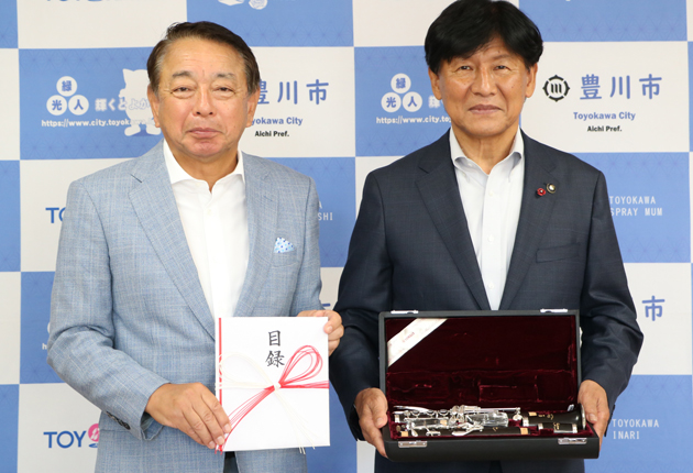 竹本市長に目録と管楽器を渡す小野さん㊧(豊川市役所で)