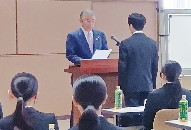 内定通知書を1人1人に手渡す山口理事長(豊橋信用金庫研修会館で)=提供