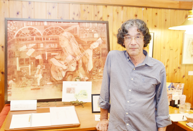 染絵作品「ストリート」と谷口さん(新城市片山のコメダ珈琲店しんしろ店で)