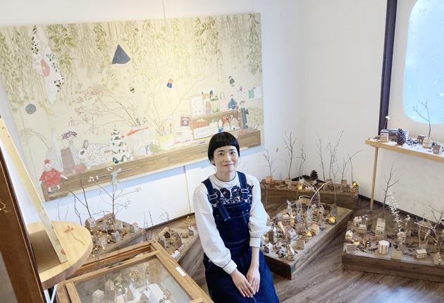豊川市出身で大阪在住の日本画家、平松絵美さんの作品展が5日、豊橋市瓦町の「うたたねばなね」で始まった。日本画8点と手作りの木の家のインスタレーション。独特の空間を楽しめる。 「地上と楽園」と題し、木の家で地上の街を、日本画で天空の楽園を表...