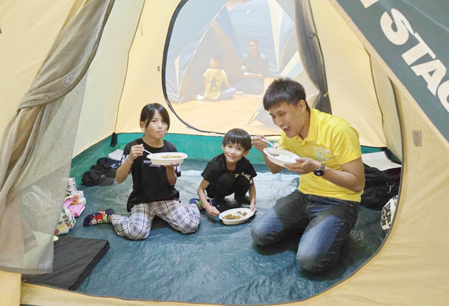 協力して組み立てたテントでカレーライスを食べる親子(八南小学校で)