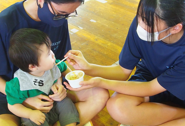 赤ちゃんに離乳食をあげる3年生たち(豊橋市高豊中学校で)