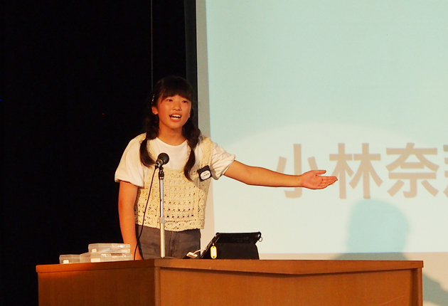 このうちおはなしショーケースでは、通常学級とイマージョン学級の3、6年生代表の4人によるプレゼンテーションがあった。児童たちは、自分の宝物や学校で体験した米作りなどについて身ぶり手ぶりを交え、スライドを使ってスピーチした。