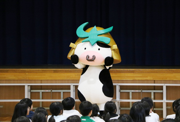 児童たちの前に登場した「くぼうしくん」(牛久保小学校で)
