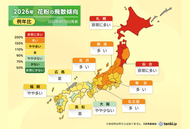 一般財団法人日本気象協会(東京)はこのほど、2026年春の花粉飛散予測の第1報を発表した。地方別傾向によると、九州から近畿では例年並みのところが多く、東海から北海道では例年より多くなるところがある見通し。愛知県・名古屋も多いと見込む。