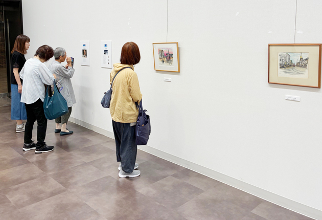 会場には人気カレンダー「市電のある風景」の原画が、過去・現在・未来に分けて展示された。デパート「丸物」の前を走る昔の市電は、どこか懐かしい雰囲気。トラムが走る未来の広小路通に思いをはせた風景とともに並び、市電と豊橋の強いつながりを感じさせる。豊橋交響楽団の定期演奏会のポスターも時代ごとに展示され、楽しめそうだ。12日まで。