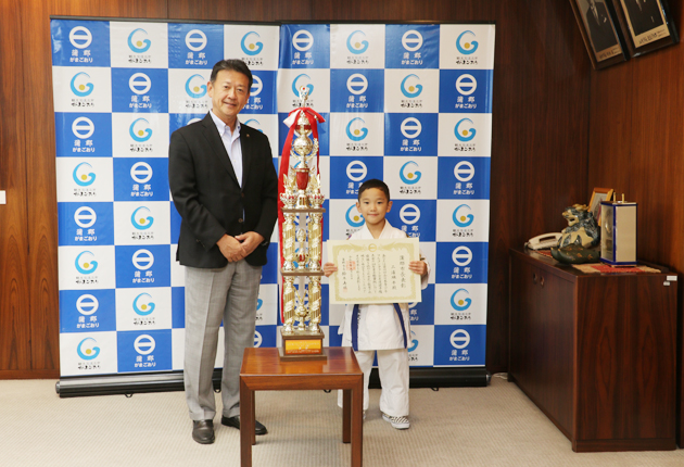 蒲郡市長表彰式がこのほど、市役所で開かれ、空手の全国大会で優勝した市立竹島小1年の三浦琳平さん(7つ)が、鈴木寿明市長から賞状を受け取った。 三浦さんは、東京都で3月に行われた「第4回全日本青少年フルコンタクト空手道選手権大会」の幼年男子...