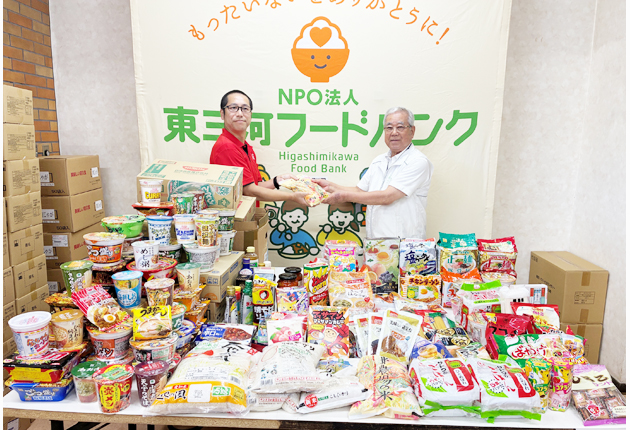 食品を手渡す吉峰支部長㊧と片桐副理事長(提供)