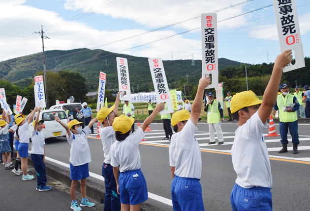隊員や署員らがドライバーにパンフレットを渡し、交通安全を呼びかけた。児童らは、歩道に並んで「めざせ交通事故死0」「全席シートベルト」などと書かれたハンドプレートを頭上に掲げた。児童らが笑顔で「シートベルトをお願いします」と声をかけると、ドライバーも笑顔で手を振っていた。
