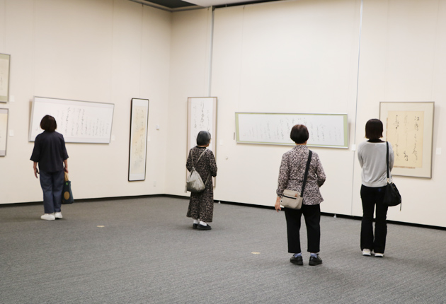 出品者は20代から90代までと幅広く、最年少の藤原亜衣さん(24)は百人一首から秋の歌を選んで変体かなで書いた作品を出品。「他の方の作品を見ることはとても勉強になる。今後の自分の作品に生かしていきたい」と話した。