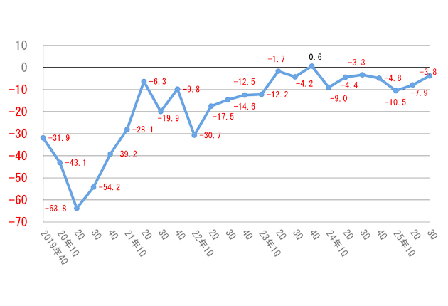 卸売業の景況感は悪化したが、小売業では28・5ポイントの大幅改善でプラス圏へ。自動車や事務用品の販売が堅調だったが、食品スーパーからは、競合店の進出や最低賃金アップに伴う人件費増加を懸念する声も聞かれた。