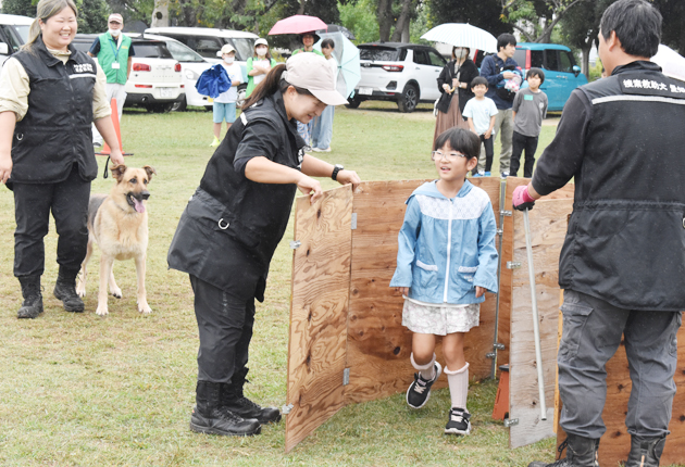 県内の訓練所の救助犬が所属する「捜索救助犬愛知」から来訪したホタル、エルマ、ヒージーの3頭が、それぞれの訓練士と行方不明者の捜索訓練に臨んだ。3つの木箱の中に隠れた町民を嗅覚だけで見つけ出すと拍手を送られ、遠隔操作や服従訓練でも忠実な姿を見せた。