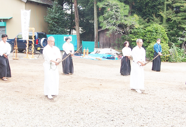 日本刀を使う武道「居合道」の「戸山流居合道東海道場」(川原義之代表)は12日、豊橋市御園町の東田神明宮境内で、「奉納演武」を行った。居合剣法や居合形、真剣を使った試し斬りなど、日ごろの修練の成果を披露した。 道着とはかま姿の会員男女8人が...