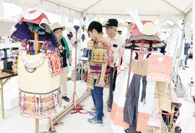 伊奈史跡保存会の手作り甲冑の試着コーナー(同)