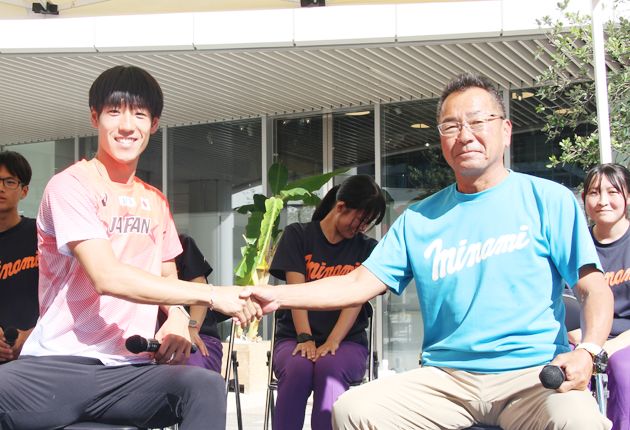師弟のトークショーは、小川選手が陸上競技を始めたきっかけや世界陸上での走りを紹介し「来年のアジア大会でメダルを取りたい」と力強い決意を示した。