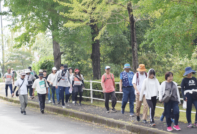 開会式で、安形博教育長が「450年前の歴史に触れながら、いい汗を流してください」とあいさつし、参加者らは薄曇りの秋空の下、笑顔で出発した。参加者全員が完歩した。