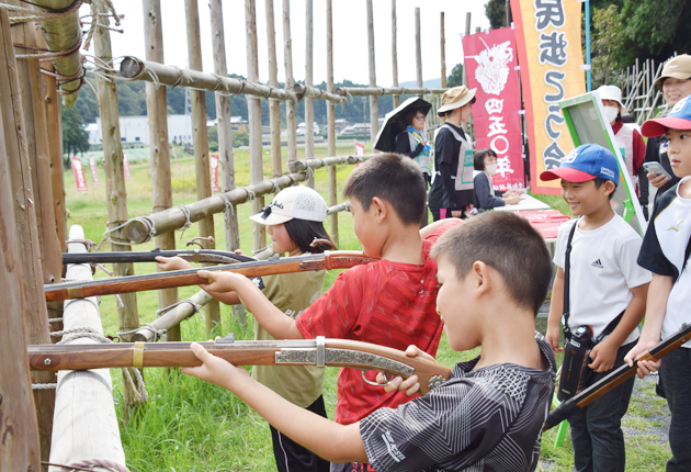 市内杉山の前崎全洋さんは、昨年に続き家族4人で参加した。「家族みんなで楽しめた」と話し、妻の由佳さんは「普段運動をしないので、子どもたちと一緒に汗が流せて良かった」と喜んだ。長男の幹太君(保育園年長)は火縄銃を抱え「思ったよりも重い」と銃を構えていた。