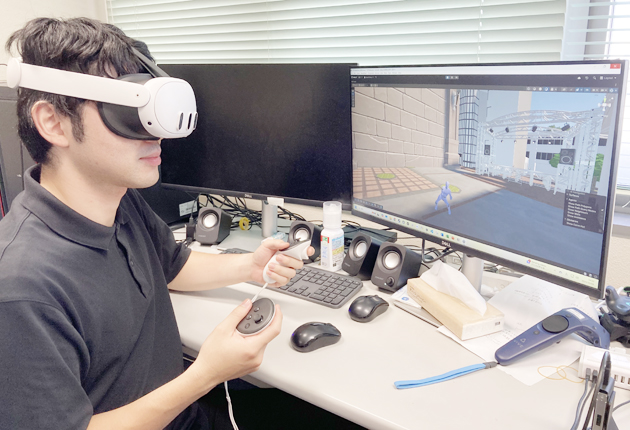 VRゴーグルをかぶってイベント用メタバースを開発する鳥海さん(豊橋技科大で)