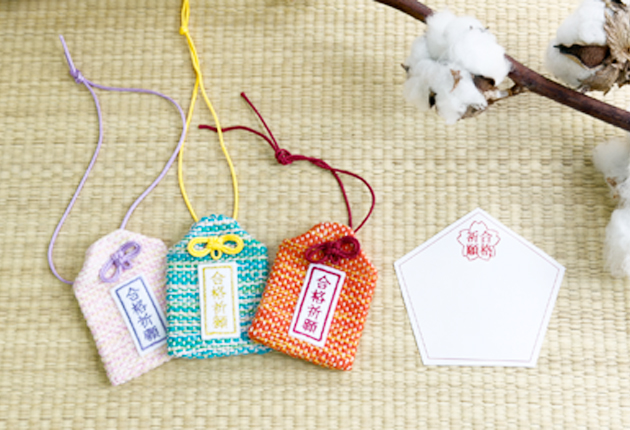 手織りで作るお守り袋と五角形の祈願カード(提供)