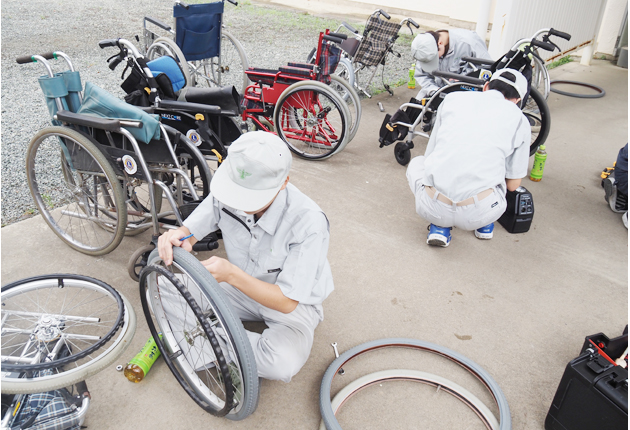 車椅子を修理する生徒たち(豊橋工科高校で)