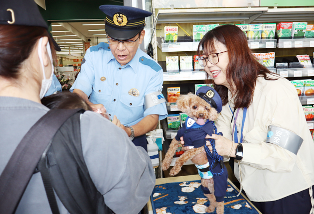 買い物客に啓発品を渡す志治署長㊥と犬のお巡りさん「ルカ」(蒲郡市・カインズ蒲郡店で)