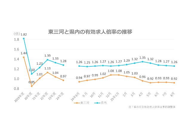 愛知労働局が取りまとめた東三河地方の8月の有効求人倍率(原数値)は0・92倍となり、前の月に比べて0・01ポイント低下した。5カ月連続で、節目となる1倍を下回った。労働局は「雇用情勢は持ち直しつつあるが、一部に弱い動きも見られ、引き続き注...